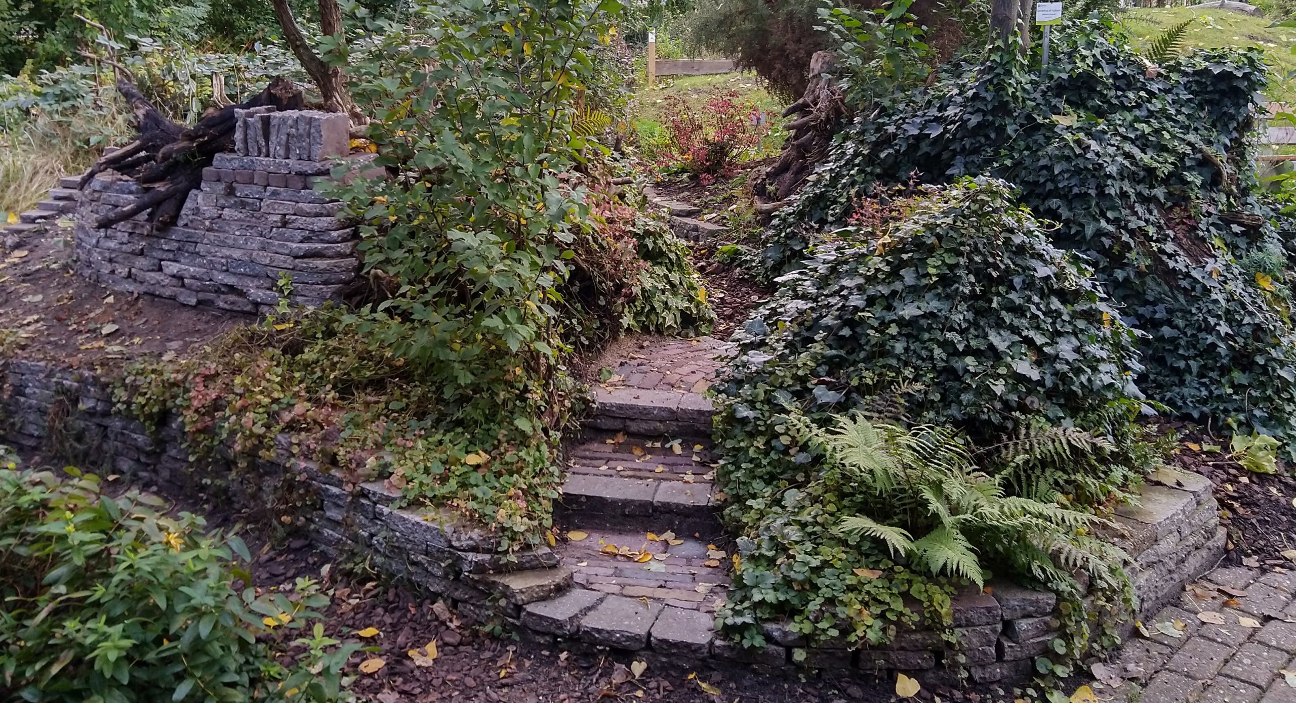 De opvallende hoogteverschillen in dit kleine deel van de Natuurtuin zijn bereikt door het stapelen van boomstronken en oud bestratingsmateriaal, zoals stoeptegels. De ontstane tuin doet daardoor denken aan een overwoekerde ruïne. In de kiertjes en gangetjes verschuilen kleine dieren zich en houden ze winterslaap. Tegelijkertijd profiteren onder meer varens, vetplantjes zoals tripmadam, muurleeuwenbek, wolfsmelk, brem en gaspeldoorn van de uitzonderlijke leefomgeving.
